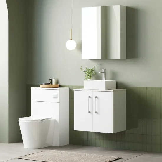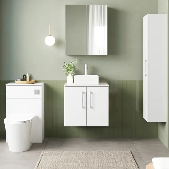This gloss white finish compliments any modern bathroom and creates a designer look. This wall hung unit creates more space in your bathroom giving the illusion of a bigger bathroom. This unit has a soft close door which limits the daily wear and tear and provides a quieter closing action. Colour co-ordinate your unit with a gloss white WC unit. Supplied with laminate worktop, for use with vessel basins (sold separately).