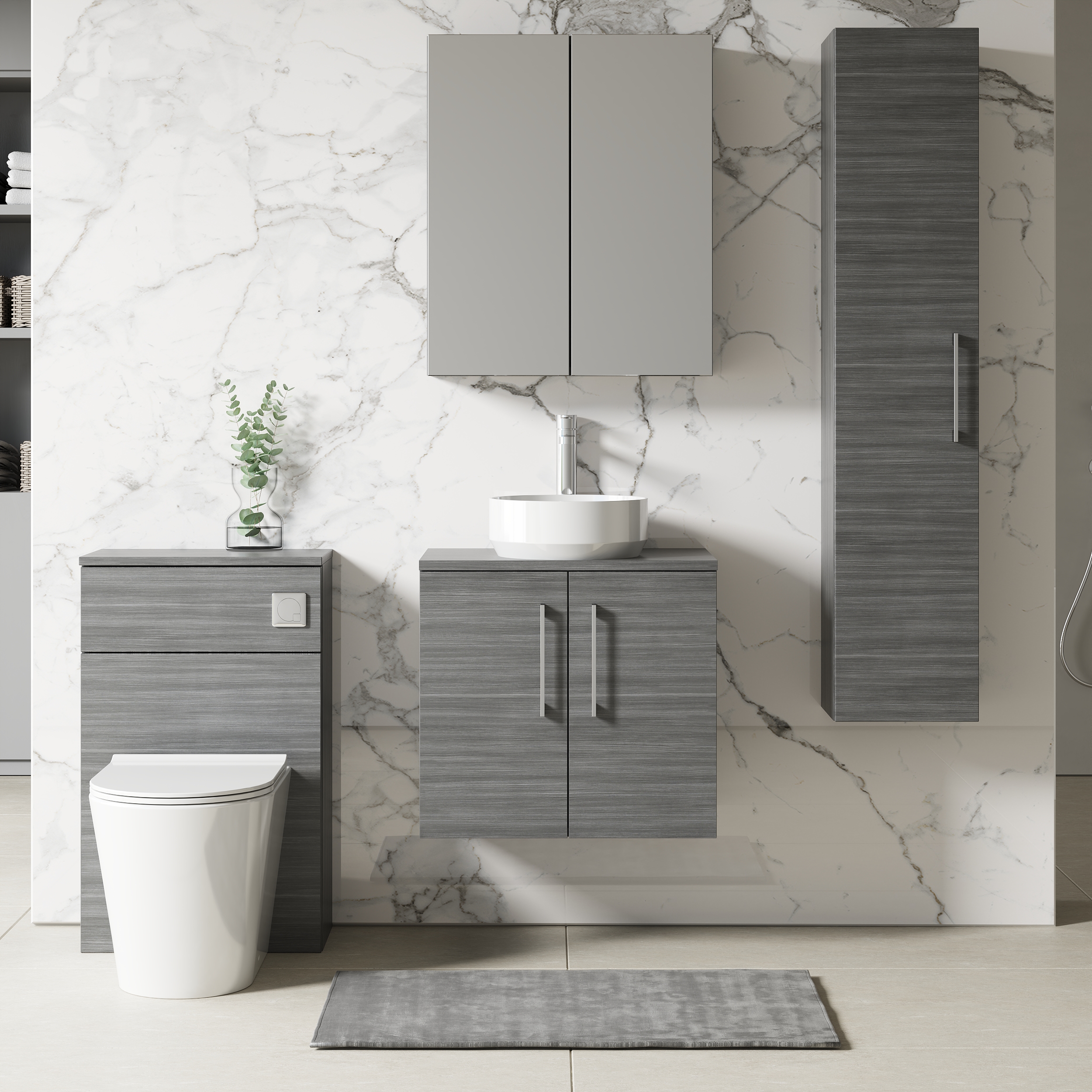 This unique anthracite finish compliments any modern bathroom and creates a designer look. This wall hung unit creates more space in your bathroom giving the illusion of a bigger bathroom. This unit has a soft close door which limits the daily wear and tear and provides a quieter closing action. Colour co-ordinate your unit with an anthracite WC unit. Supplied with worktop.