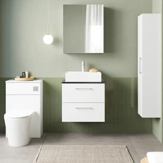 This gloss white finish compliments any modern bathroom and creates a designer look. This wall hung unit creates more space in your bathroom giving the illusion of a bigger bathroom. This unit has soft close drawers which limits the daily wear and tear and provides a quieter closing action. Colour co-ordinate your unit with a gloss white WC unit. Supplied with laminate worktop, for use with vessel basins (sold separately).