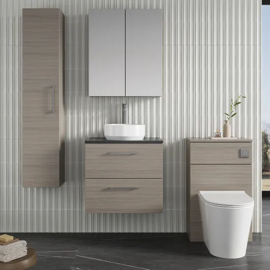 This unique solace oak finish compliments any modern bathroom and creates a designer look. This wall hung unit creates more space in your bathroom giving the illusion of a bigger bathroom. This unit has soft close drawers which limits the daily wear and tear and provides a quieter closing action. Colour co-ordinate your unit with a solace oak WC unit. Supplied with laminate worktop, for use with vessel basins (sold separately).