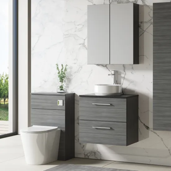 This unique anthracite compliments any modern bathroom and creates a designer look. This wall hung unit creates more space in your bathroom giving the illusion of a bigger bathroom. This unit has soft close drawers which limits the daily wear and tear and provides a quieter closing action. Colour co-ordinate your unit with an anthracite WC unit. Supplied with laminate worktop, for use with vessel basins (sold separately).