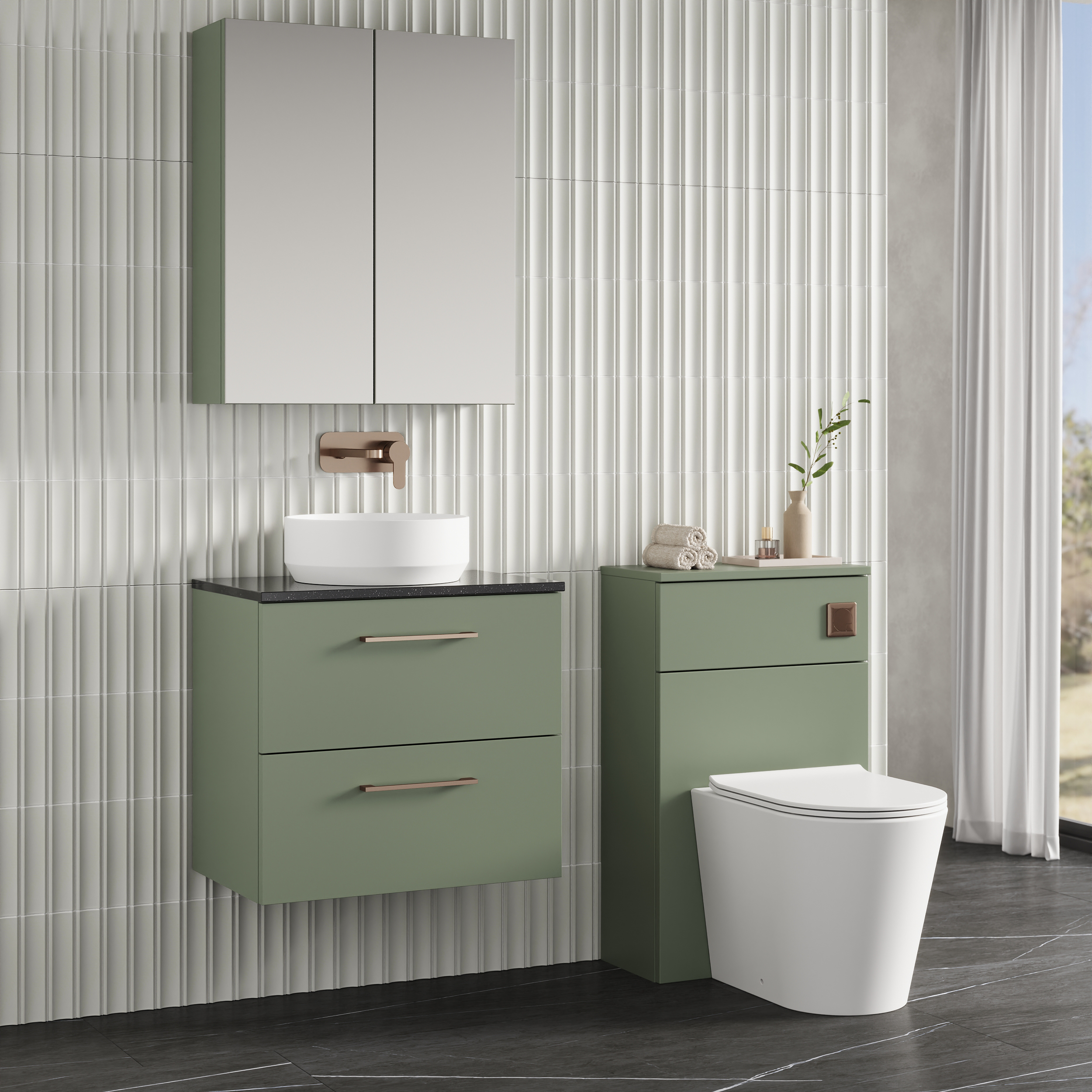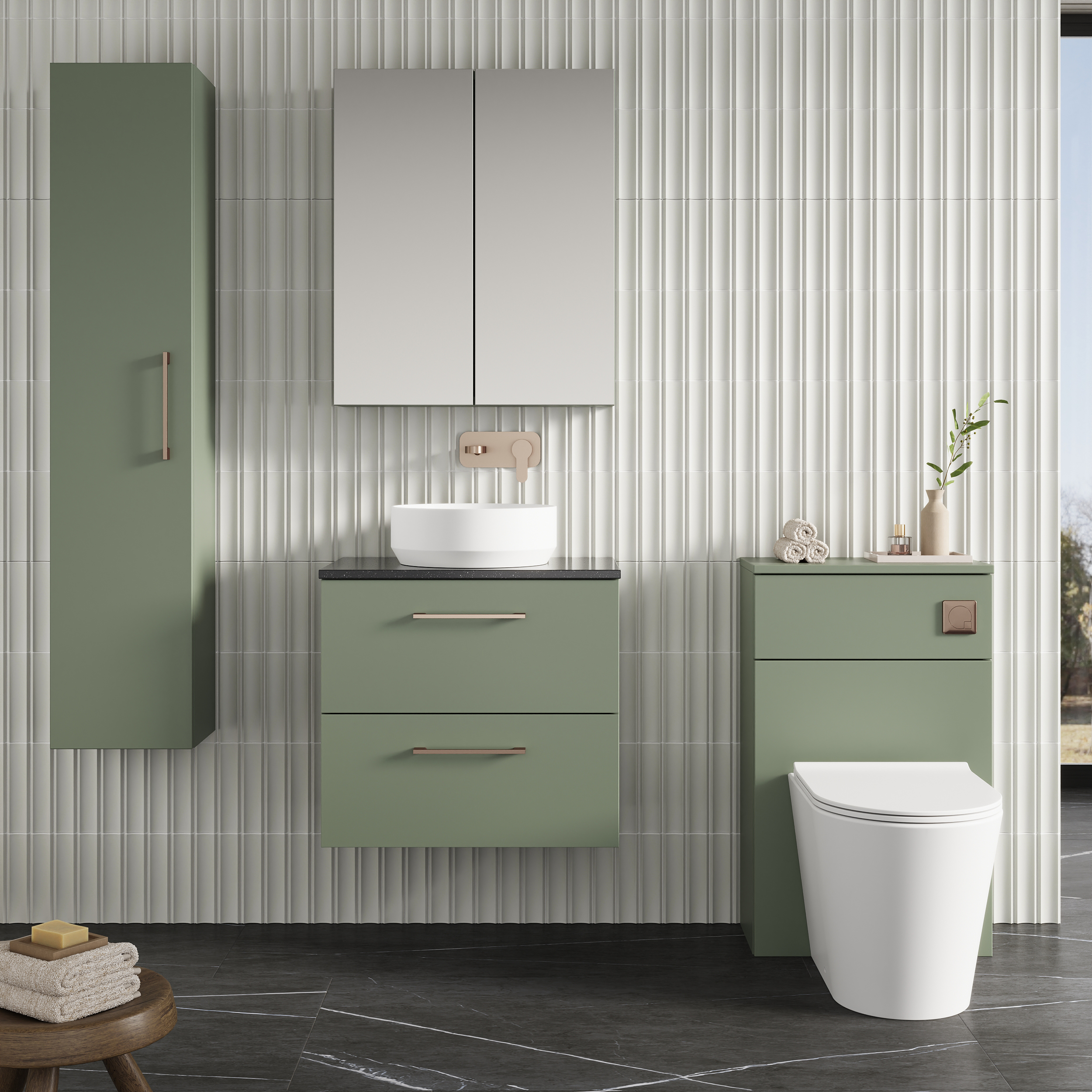 This unique green finish compliments any modern bathroom and creates a designer look. This wall hung unit creates more space in your bathroom giving the illusion of a bigger bathroom. This unit has soft close drawers which limits the daily wear and tear and provides a quieter closing action. Colour co-ordinate your unit with a green WC unit. Supplied with laminate worktop, for use with vessel basins (sold separately).