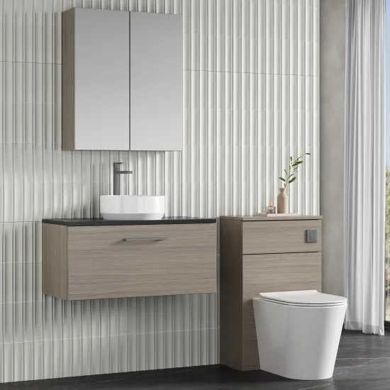 This unique solace oak finish compliments any modern bathroom to create a designer look. This wall hung unit creates more space in your bathroom giving the illusion of a bigger bathroom. This unit has soft close drawers which limits the daily wear and tear and provides a quieter closing action. Colour co-ordinate your unit with a solace oak WC unit. Supplied with laminate worktop, for use with vessel basins (sold separately).