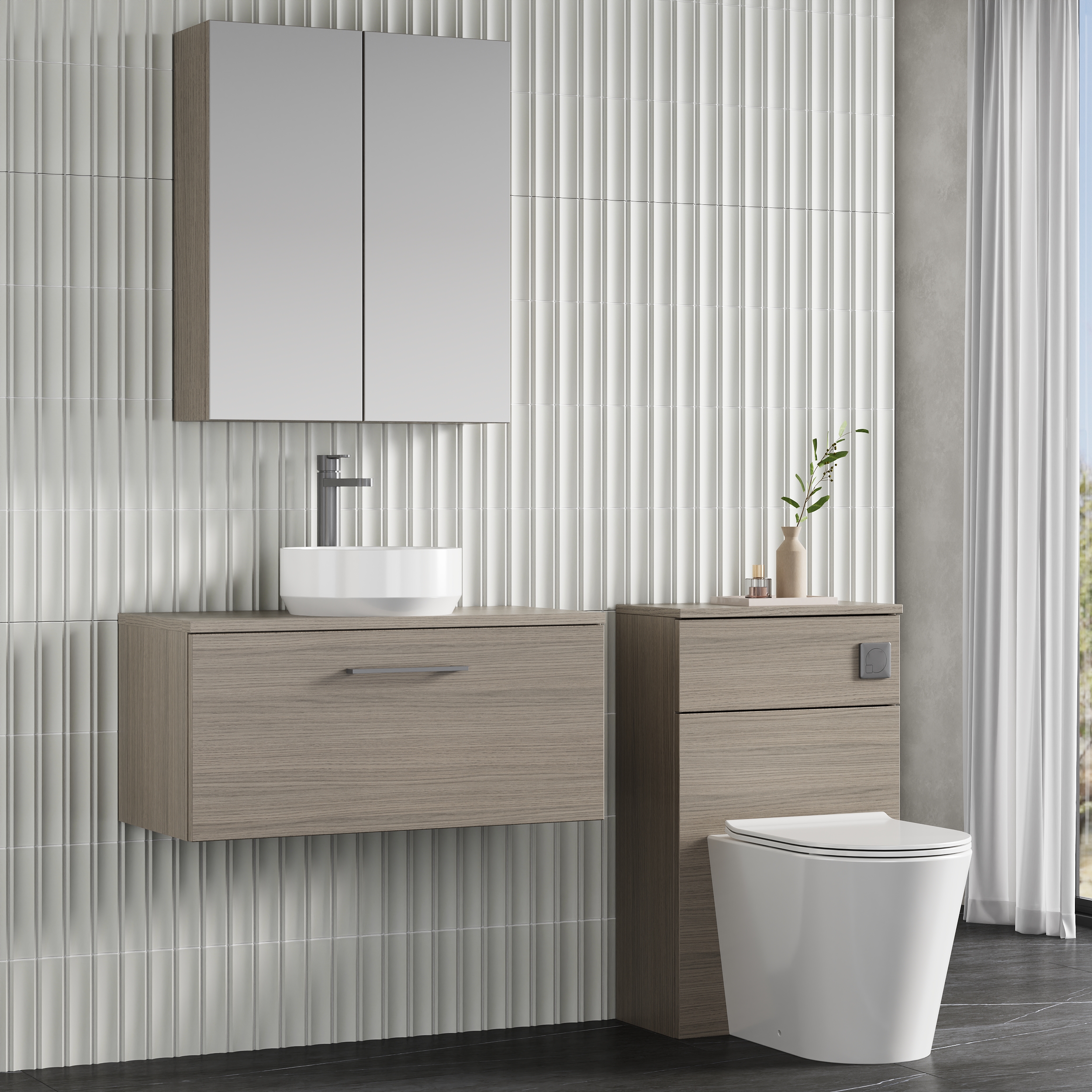 This unique solace oak finish compliments any modern bathroom and creates a designer look. This wall hung unit creates more space in your bathroom giving the illusion of a bigger bathroom. This unit has soft close drawers which limits the daily wear and tear and provides a quieter closing action. Colour co-ordinate your unit with a solace oak WC unit. Supplied with high quality matching work top for use with vessel basins. Vessel sold seperately.