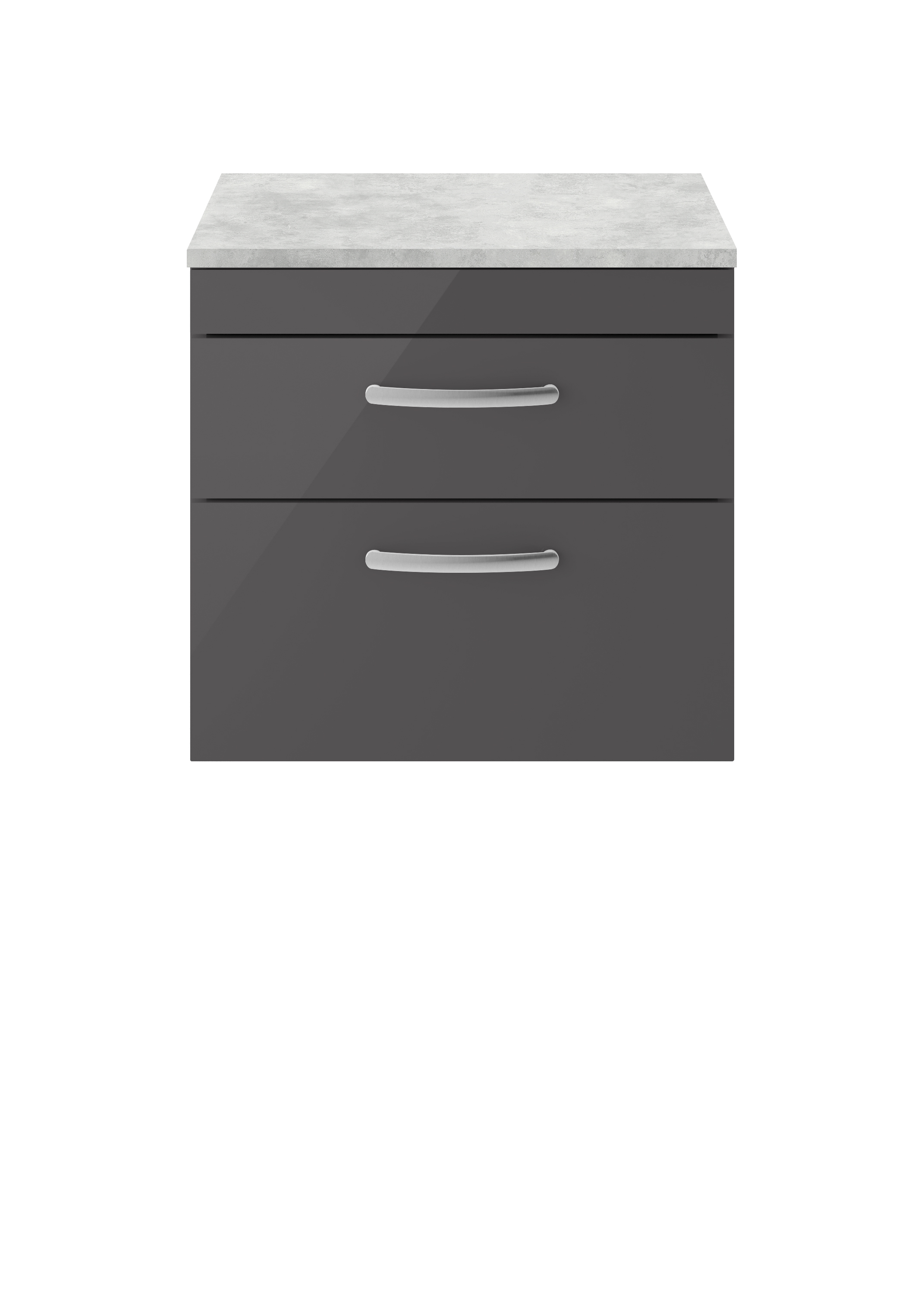 nuie Athena Wall Hung 2 Drawer Vanity With Grey Worktop 600mm - Gloss Grey