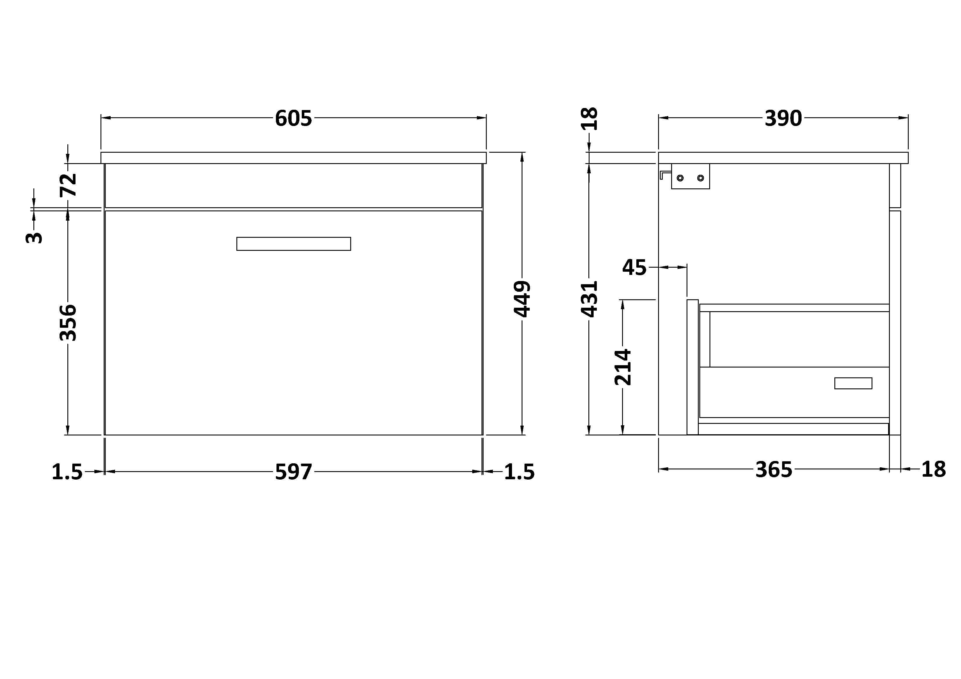 Athena Wall Hung Single Drawer Vanity With Worktop 600mm