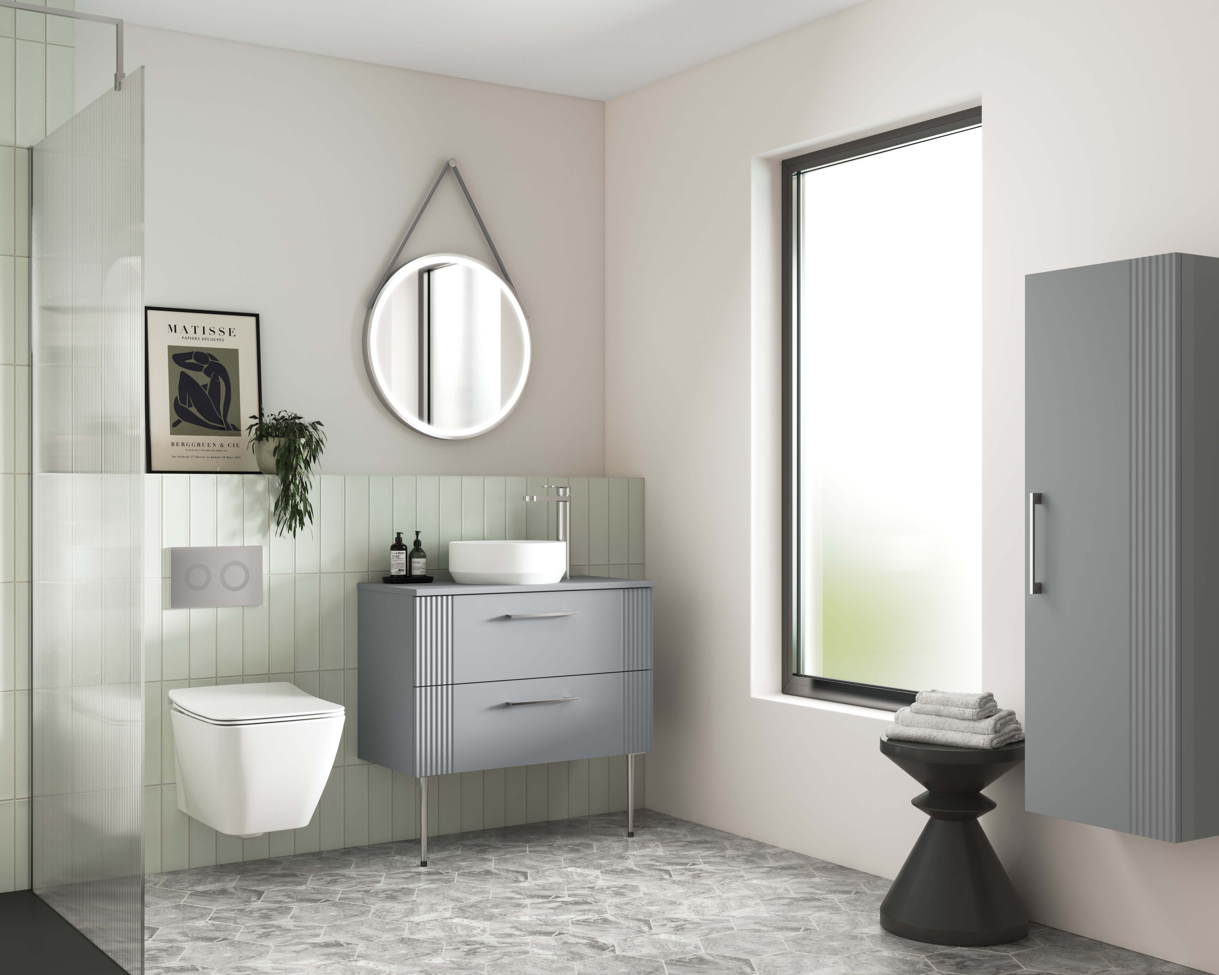 Part fluted design ideal for a striking art deco styled bathroom. Stunning satin finish. Soft close doors and drawers ensures peace ensues throughout your home. Supplied rigid for easy installation. Co-ordinating worktop for use with vessel basin (sold separately).