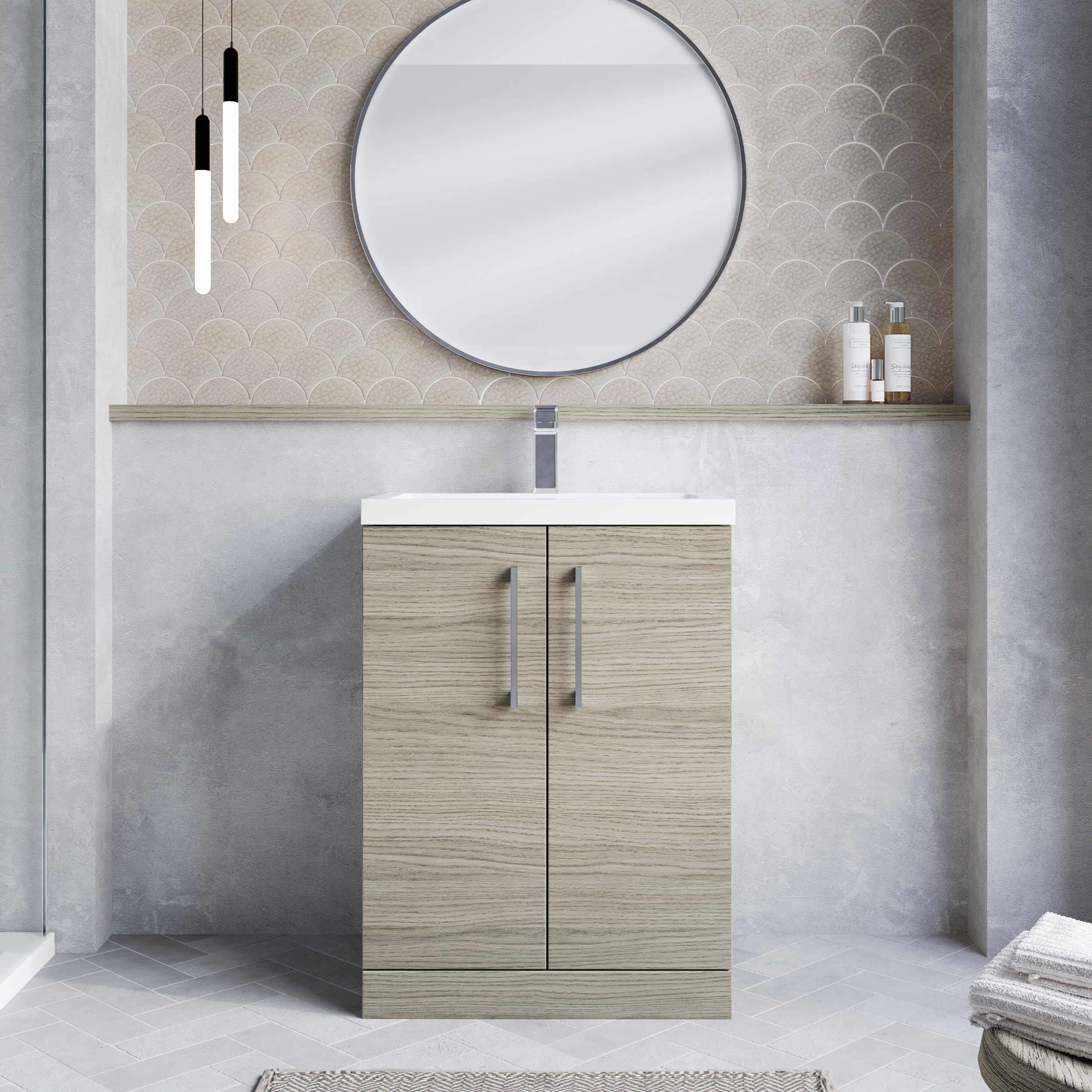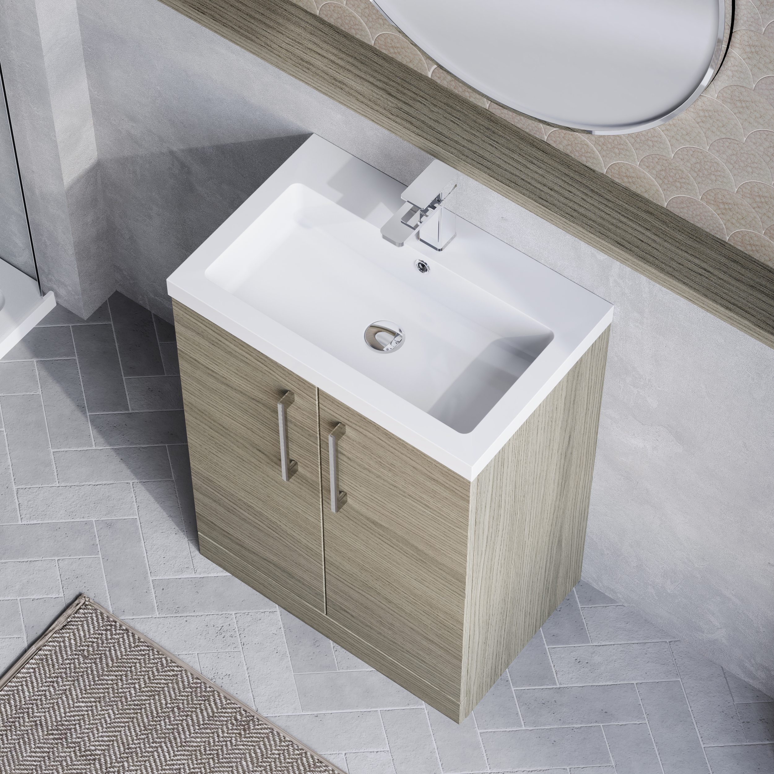 nuie Arno Compact 600mm Floor Standing 2-Door Vanity & Polymarble Basin - Solace Oak