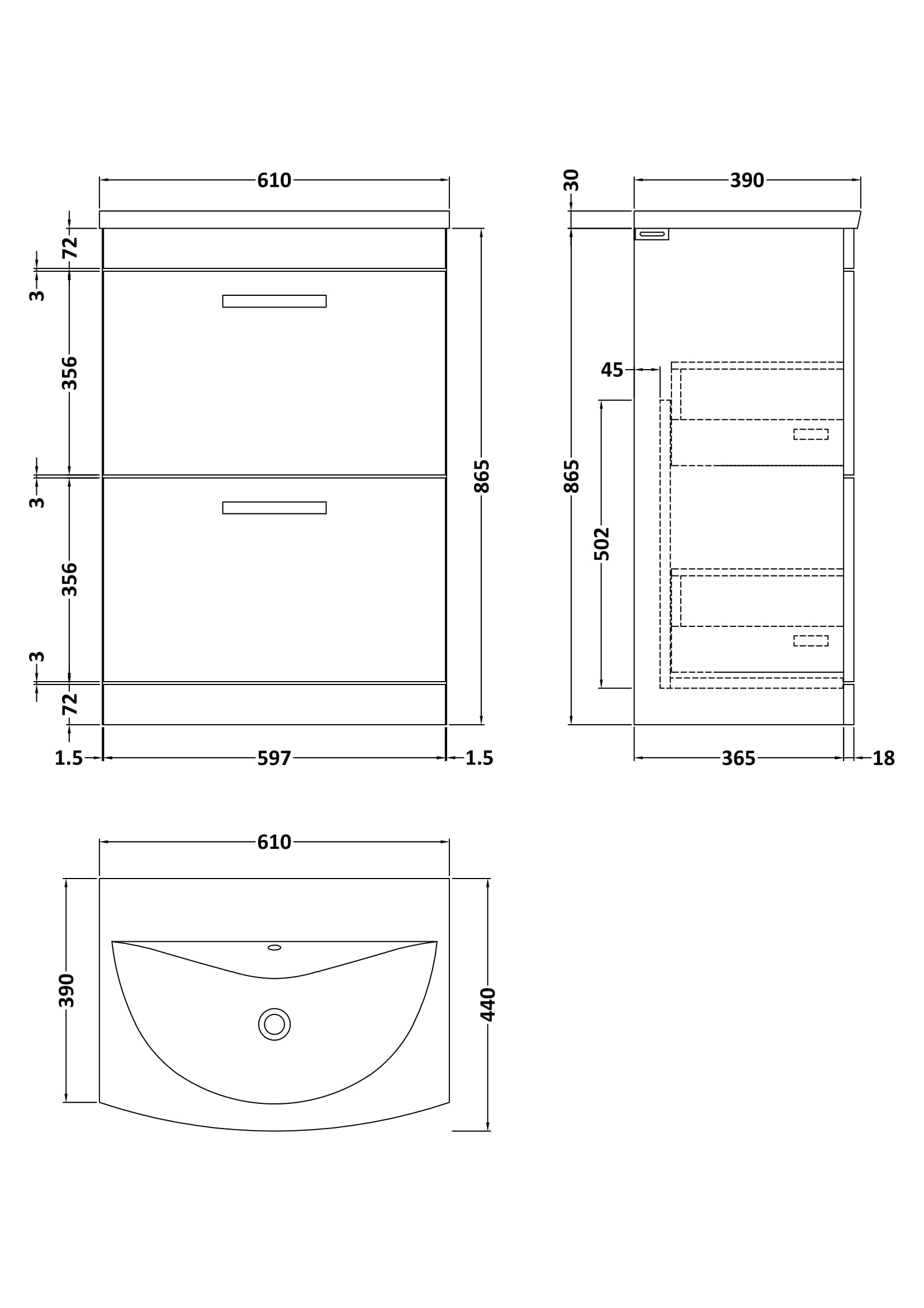 Athena Floor Standing 2 Drawer Vanity With Curved 1 Tap Hole Basin 600mm
