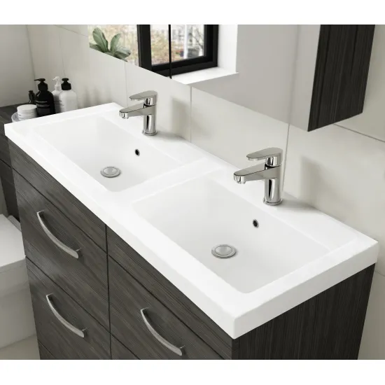 This stiking Charcoal Black finish adds impact and contast to any modern bathroom and creates a designer look. This floor standing unit gives ample storage, perfect for a busy family bathroom. This unit has soft close drawers which limits the daily wear and tear and provides a quieter closing action. Colour co-ordinate your unit with a Charcoal Black WC unit. Supplied with high quality double polymarble basin.