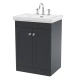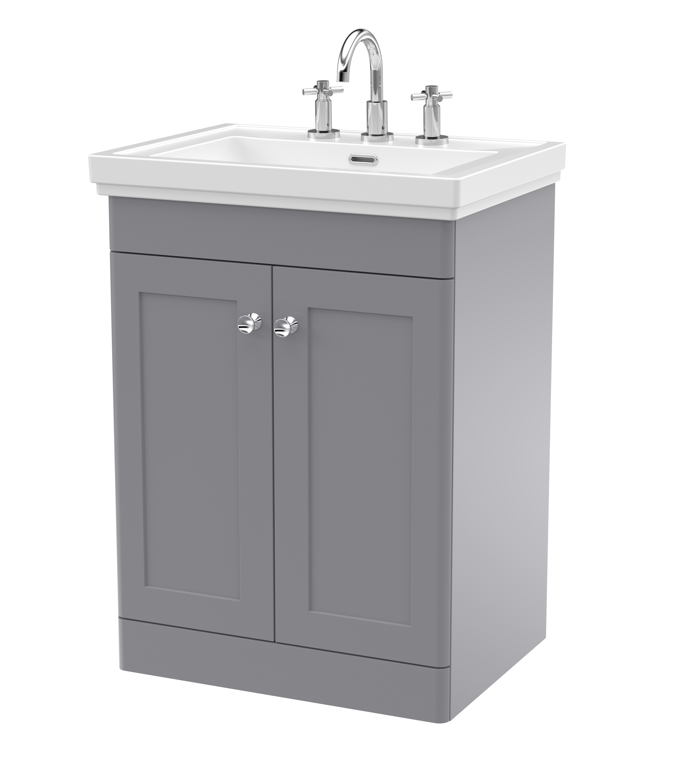 nuie Classique Floor Standing 2 Door Vanity Basin Unit & 3 Tap Hole Fireclay Basin, 600mm - Satin Grey