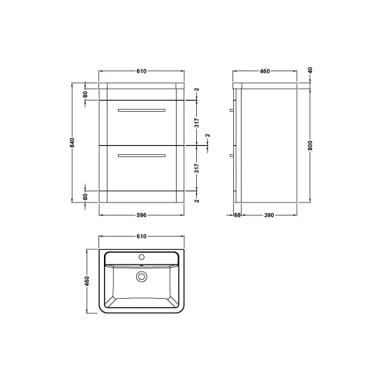 Solar Wall Hung 2 Drawer Vanity Unit with Ceramic Basin 600mm