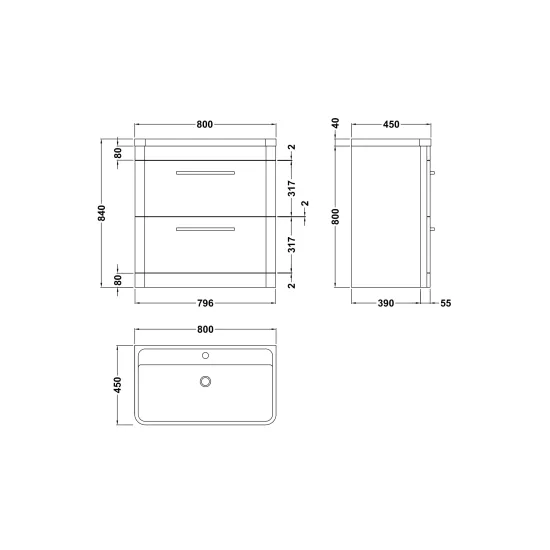 Solar Wall Hung 2 Drawer Vanity Unit with Polymarble Basin 800mm