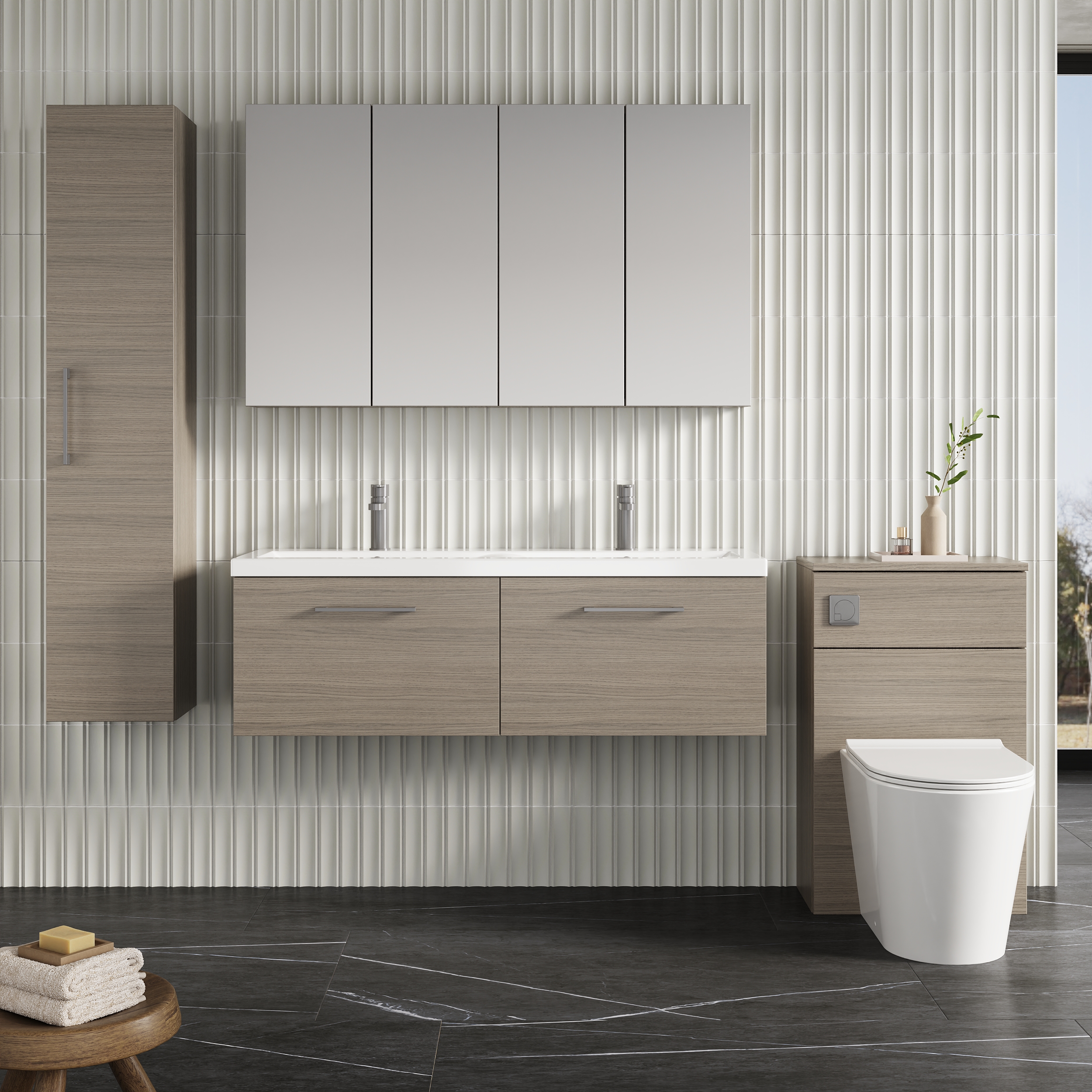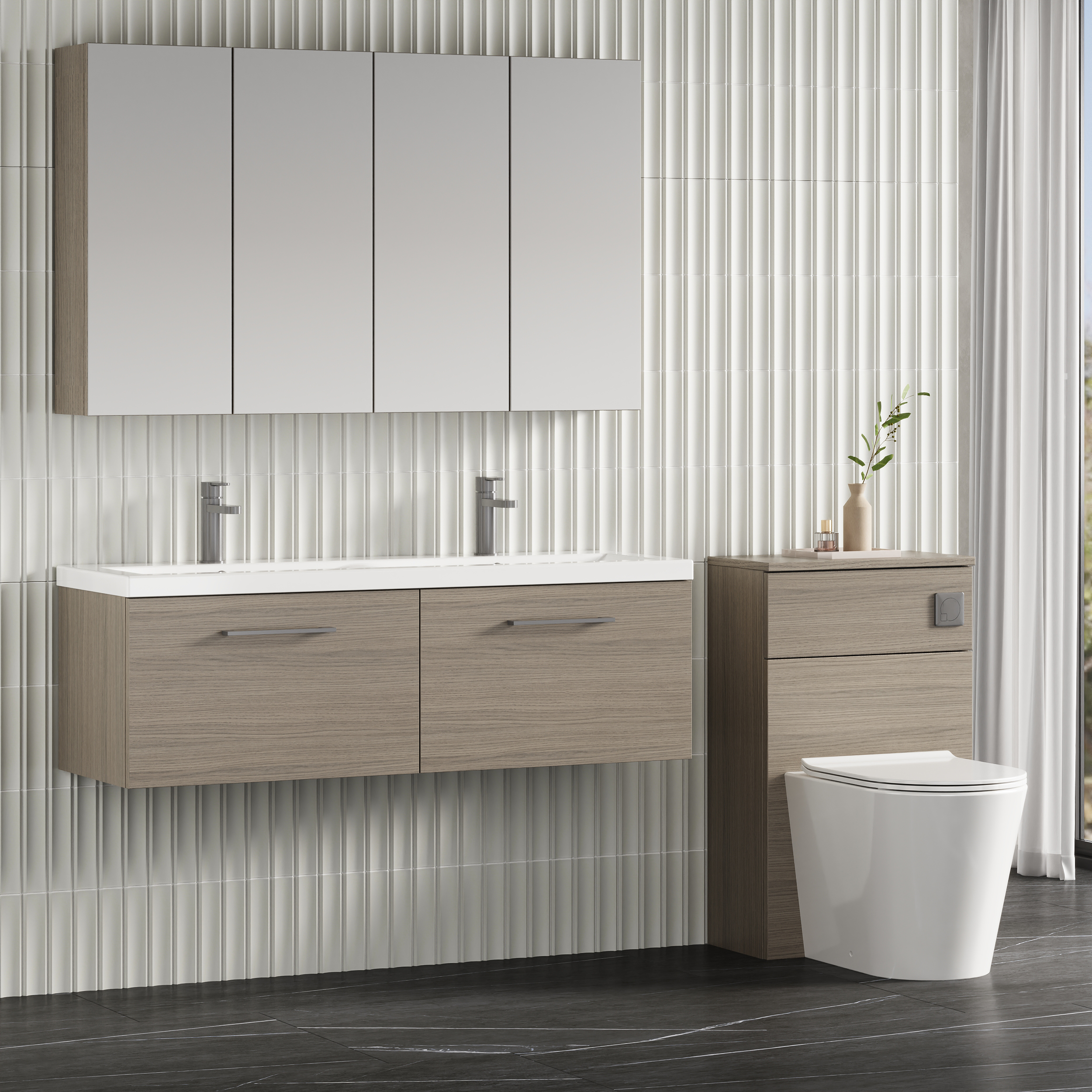 This unique solace oak finish compliments any modern bathroom to create a designer look. This wall hung unit creates more space in your bathroom giving the illusion of a bigger bathroom. This unit has soft close drawers which limits the daily wear and tear and provides a quieter closing action. Colour co-ordinate your unit with a solace oak WC unit. Supplied with high quality ceramic basin.