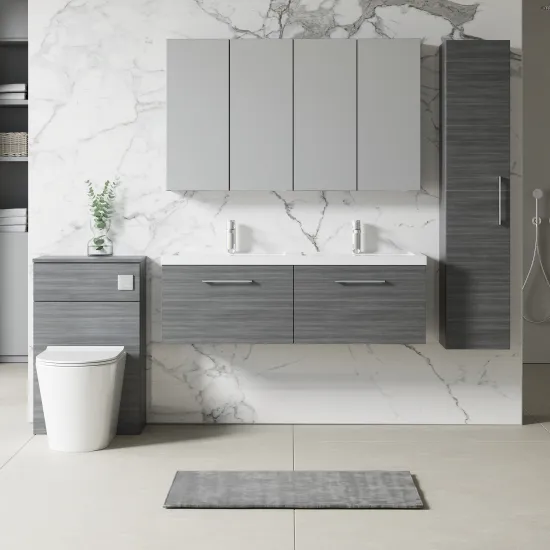 This unique anthracite finish compliments any modern bathroom to create a designer look. This wall hung unit creates more space in your bathroom giving the illusion of a bigger bathroom. This unit has soft close drawers which limits the daily wear and tear and provides a quieter closing action. Colour co-ordinate your unit with an anthracite WC unit. Supplied with high quality polymarble basin.