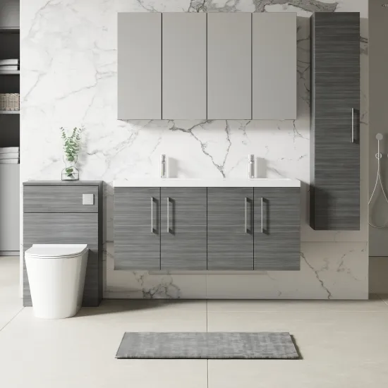 This unique anthracite finish compliments any modern bathroom to create a designer look. This wall hung unit creates more space in your bathroom giving the illusion of a bigger bathroom. This unit has soft close doors which limits the daily wear and tear and provides a quieter closing action. Colour co-ordinate your unit with an anthracite WC unit. Supplied with high quality ceramic basin.