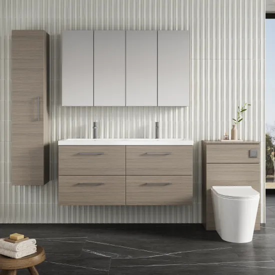 This unique solace oak finish compliments any modern bathroom to create a designer look. This wall hung unit creates more space in your bathroom giving the illusion of a bigger bathroom. This unit has soft close drawers which limits the daily wear and tear and provides a quieter closing action. Colour co-ordinate your unit with a solace oak WC unit. Supplied with high quality ceramic basin.