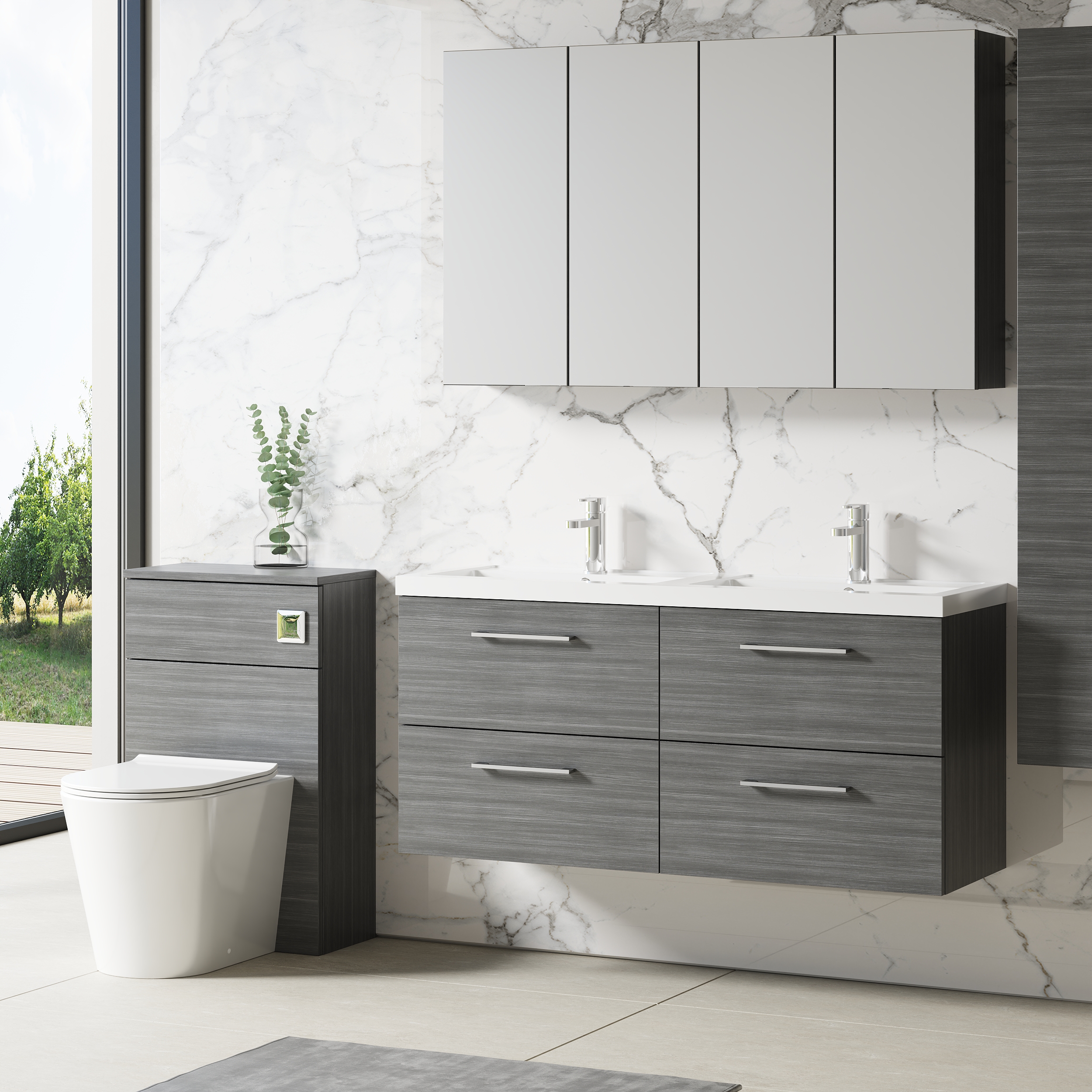 This unique anthracite finish compliments any modern bathroom to create a designer look. This wall hung unit creates more space in your bathroom giving the illusion of a bigger bathroom. This unit has soft close drawers which limits the daily wear and tear and provides a quieter closing action. Colour co-ordinate your unit with an anthracite WC unit. Supplied with high quality polymarble basin.