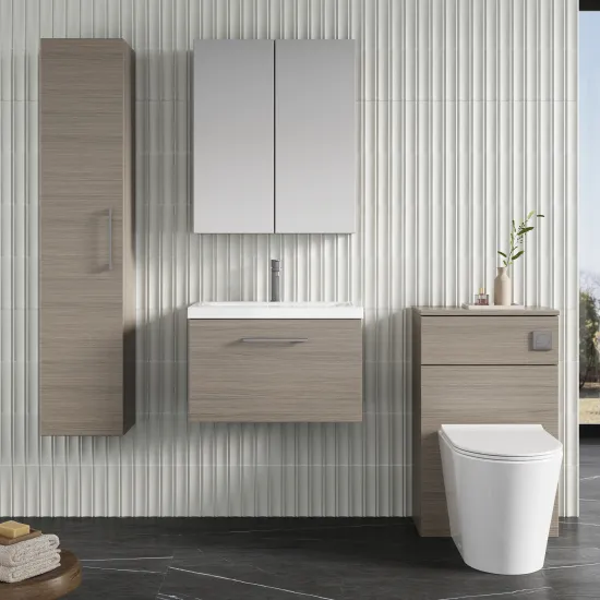 This unique solace oak finish compliments any modern bathroom and creates a designer look. This wall hung unit creates more space in your bathroom giving the illusion of a bigger bathroom. This unit has soft close doors which limits the daily wear and tear and provides a quieter closing action. Colour co-ordinate your unit with a solace oak WC unit. Supplied with high quality vitreous china basin.