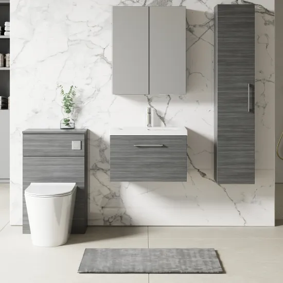 This unique anthracite finish compliments any modern bathroom and creates a designer look. This wall hung unit creates more space in your bathroom giving the illusion of a bigger bathroom. This unit has soft close doors which limits the daily wear and tear and provides a quieter closing action. Colour co-ordinate your unit with an anthracite WC unit. Supplied with high quality vitreous china basin.