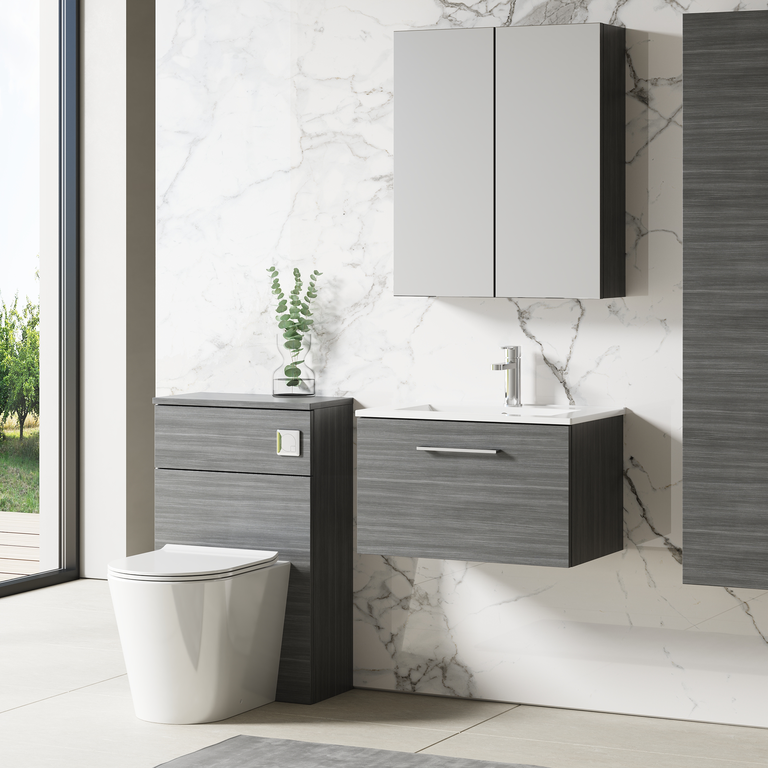 This unique anthracite finish compliments any modern bathroom and creates a designer look. This wall hung unit creates more space in your bathroom giving the illusion of a bigger bathroom. This unit has soft close doors which limits the daily wear and tear and provides a quieter closing action. Colour co-ordinate your unit with an anthracite WC unit. Supplied with high quality vitreous china basin.