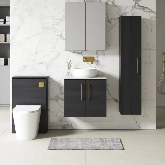 This unique charcoal black finish compliments any modern bathroom and creates a designer look. This wall hung unit creates more space in your bathroom giving the illusion of a bigger bathroom. This unit has soft close doors which limits the daily wear and tear and provides a quieter closing action. Colour co-ordinate your unit with a charcoal black WC unit. Supplied with laminate worktop, for use with vessel basins (sold separately).
