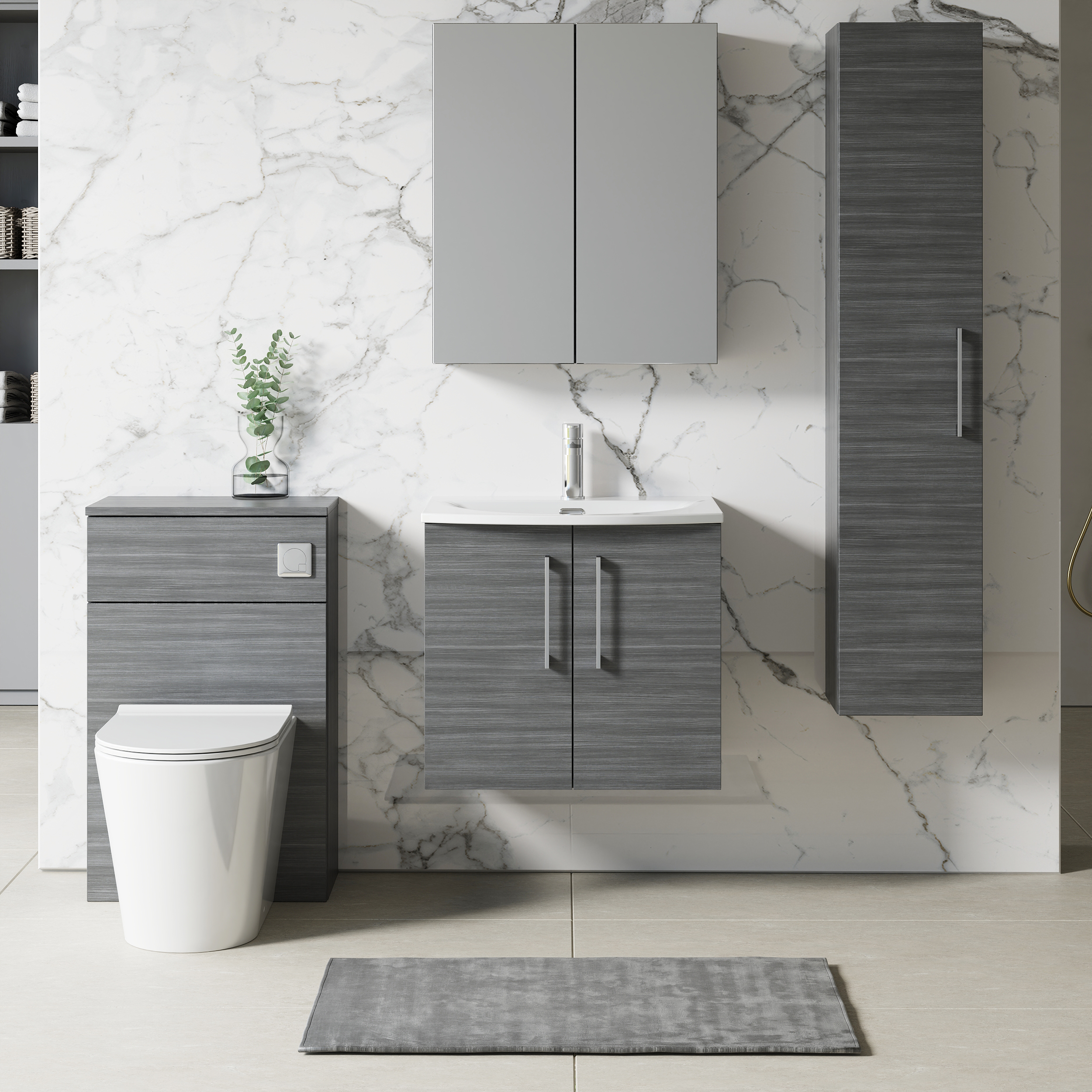 This unique anthracite finish compliments any modern bathroom to create a designer look. This wall hung unit creates more space in your bathroom giving the illusion of a bigger bathroom. This unit has soft close drawers which limits the daily wear and tear and provides a quieter closing action. Colour co-ordinate your unit with an anthracite WC unit. Supplied with high quality vitreous china basin.