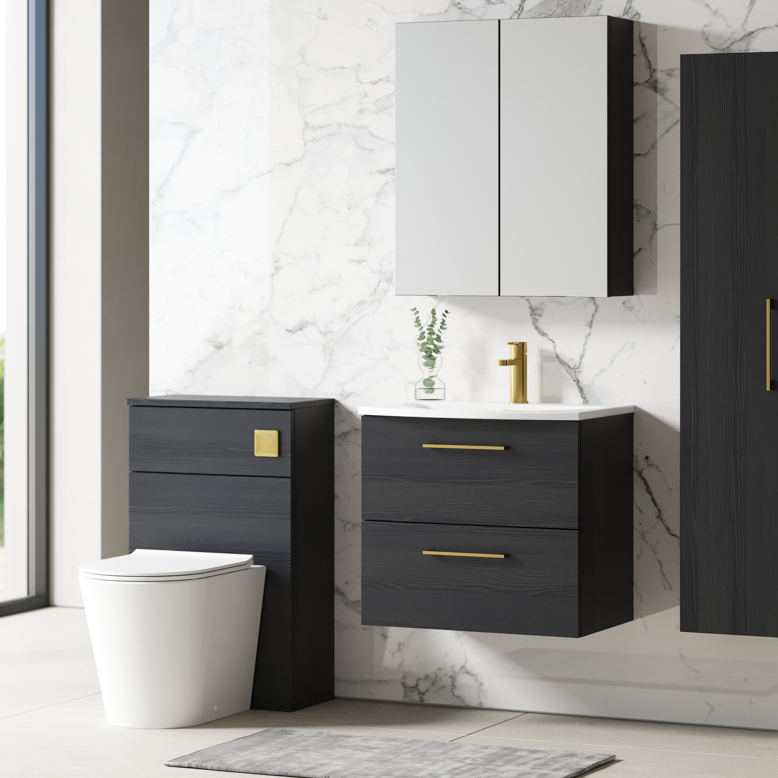This unique charcoal black finish compliments any modern bathroom to create a designer look. This wall hung unit creates more space in your bathroom giving the illusion of a bigger bathroom. This unit has soft close drawers which limits the daily wear and tear and provides a quieter closing action. Colour co-ordinate your unit with a charcoal black WC unit. Supplied with high quality vitreous china basin.