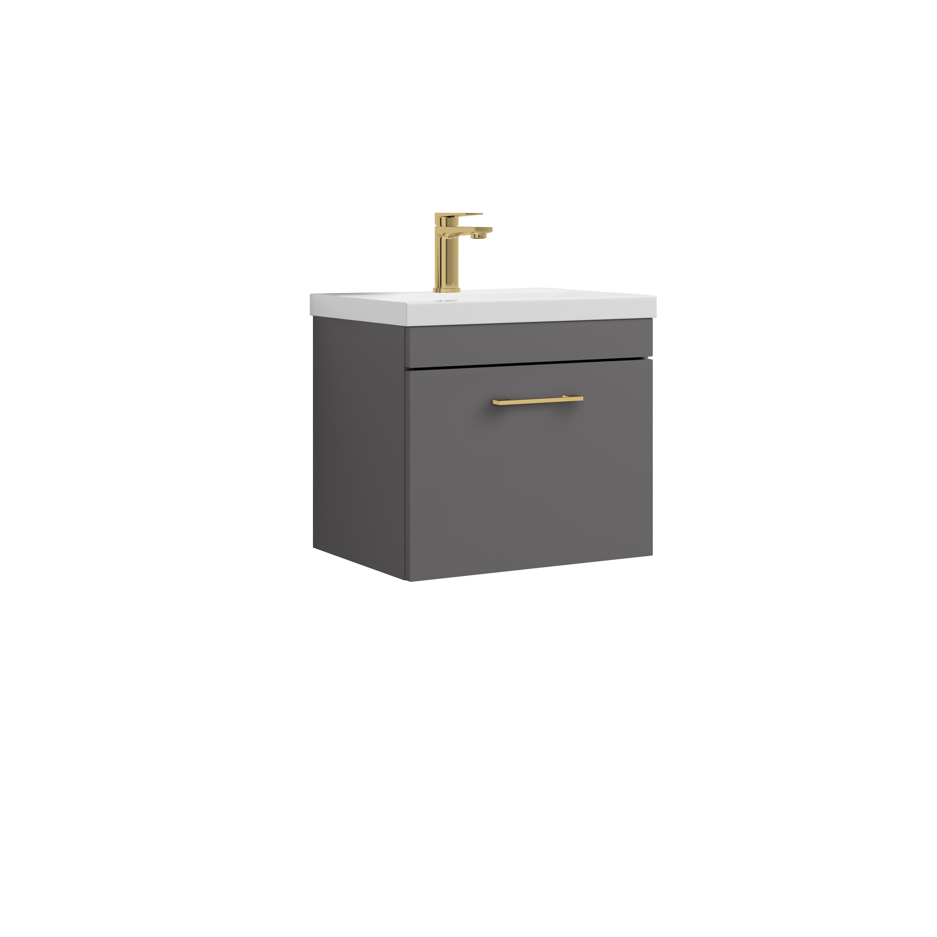 nuie Athena Wall Hung 1 Drawer Vanity with Ceramic Mid-Edge Basin and Handle 500mm - Gloss Grey/Brushed Brass