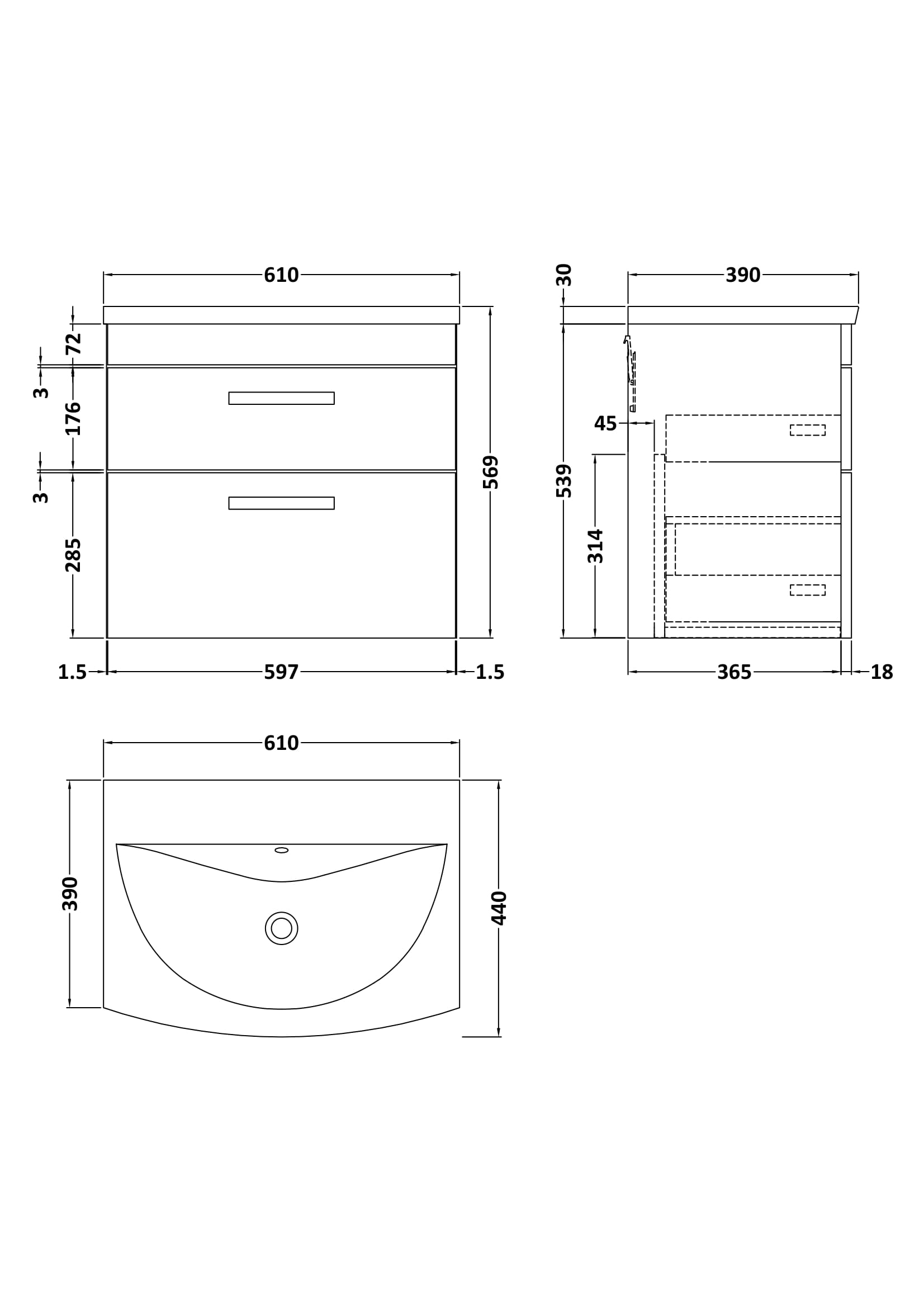 Athena Wall Hung 2 Drawer Vanity With Curved 1 Tap Hole Basin 600mm