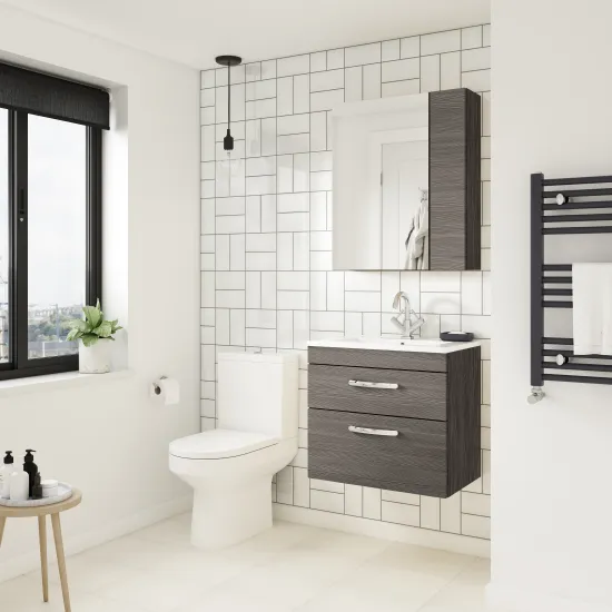 This eye catching anthracite woodgrain finish compliments any modern bathroom to create a designer look. This wall hung unit creates more space in your bathroom giving the illusion of a bigger bathroom. This unit has soft close drawers which limits the daily wear and tear and provides a quieter closing action. Colour co-ordinate your unit with a anthracite woodgrain WC unit. Supplied with high quality vitreous china basin.