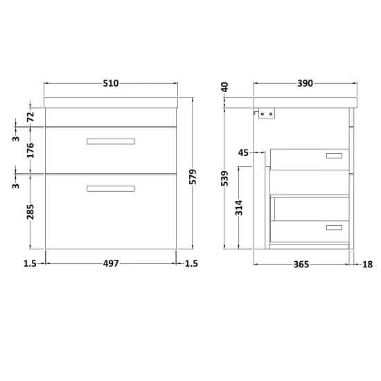 Athena Wall Hung 2 Drawer Vanity With Mid-Edge 1 Tap Hole Basin 500mm