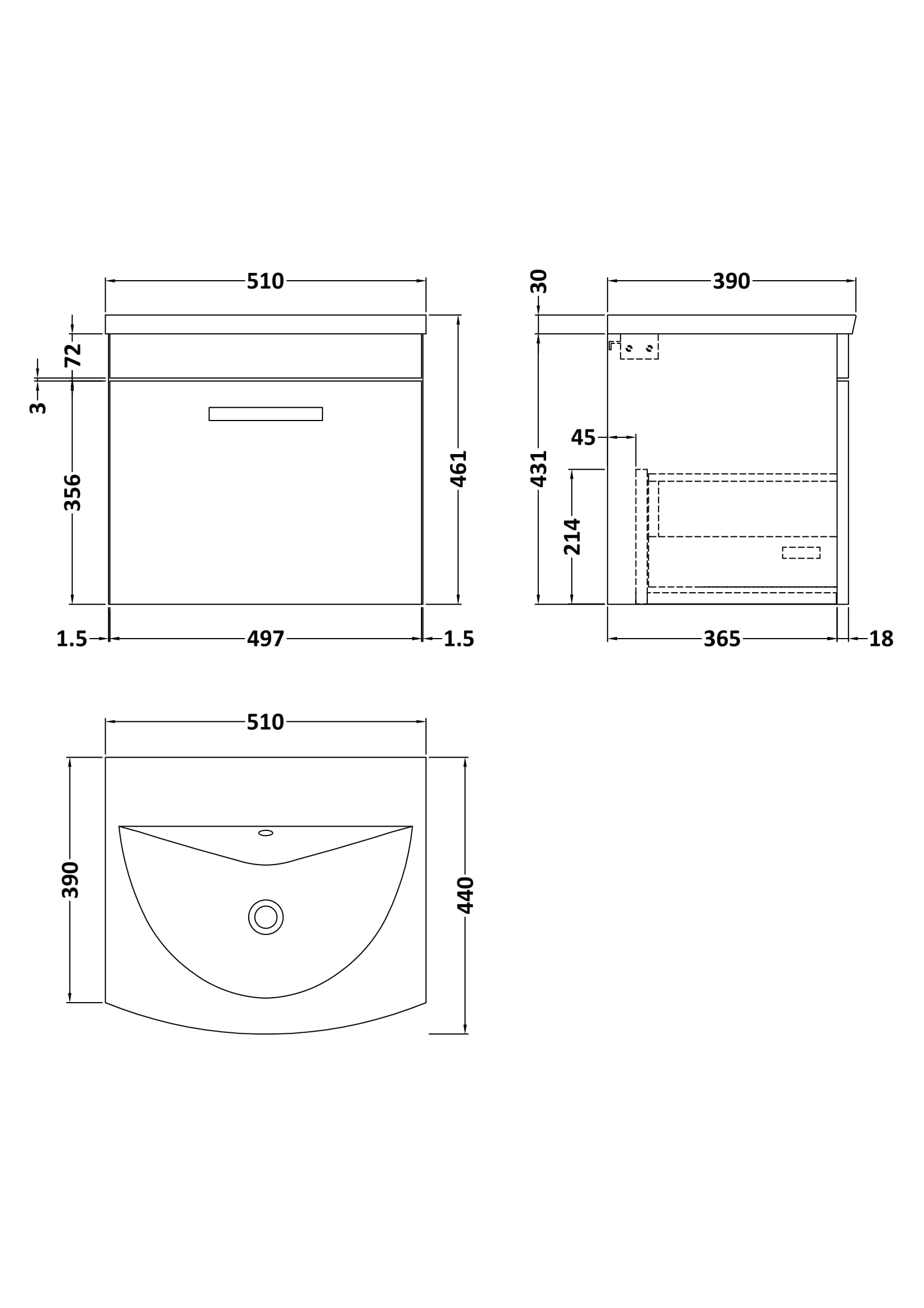 Athena Wall Hung Single Drawer Vanity With Curved 1 Tap Hole Basin 500mm