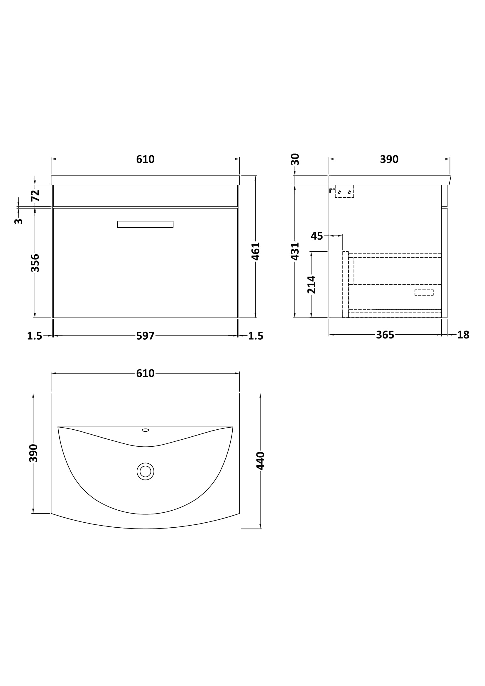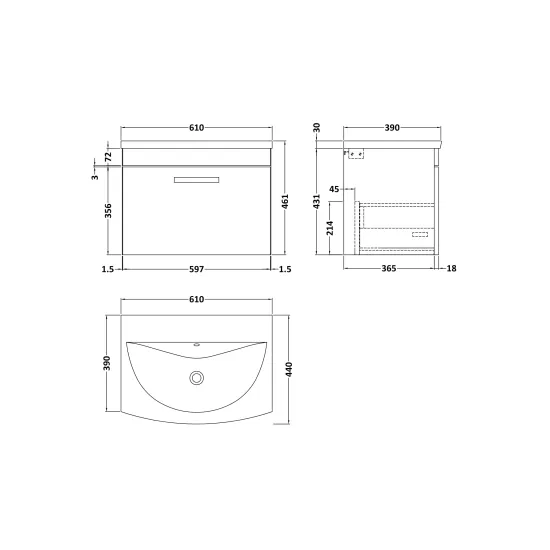 Athena Wall Hung Single Drawer Vanity With Curved 1 Tap Hole Basin 600mm