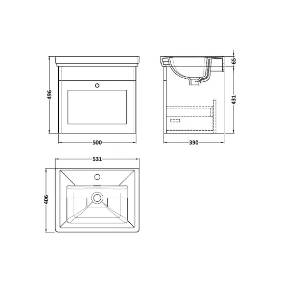 Classique Wall Hung 1 Drawer Vanity Basin Unit & 1 Tap Hole Fireclay Basin, 500mm