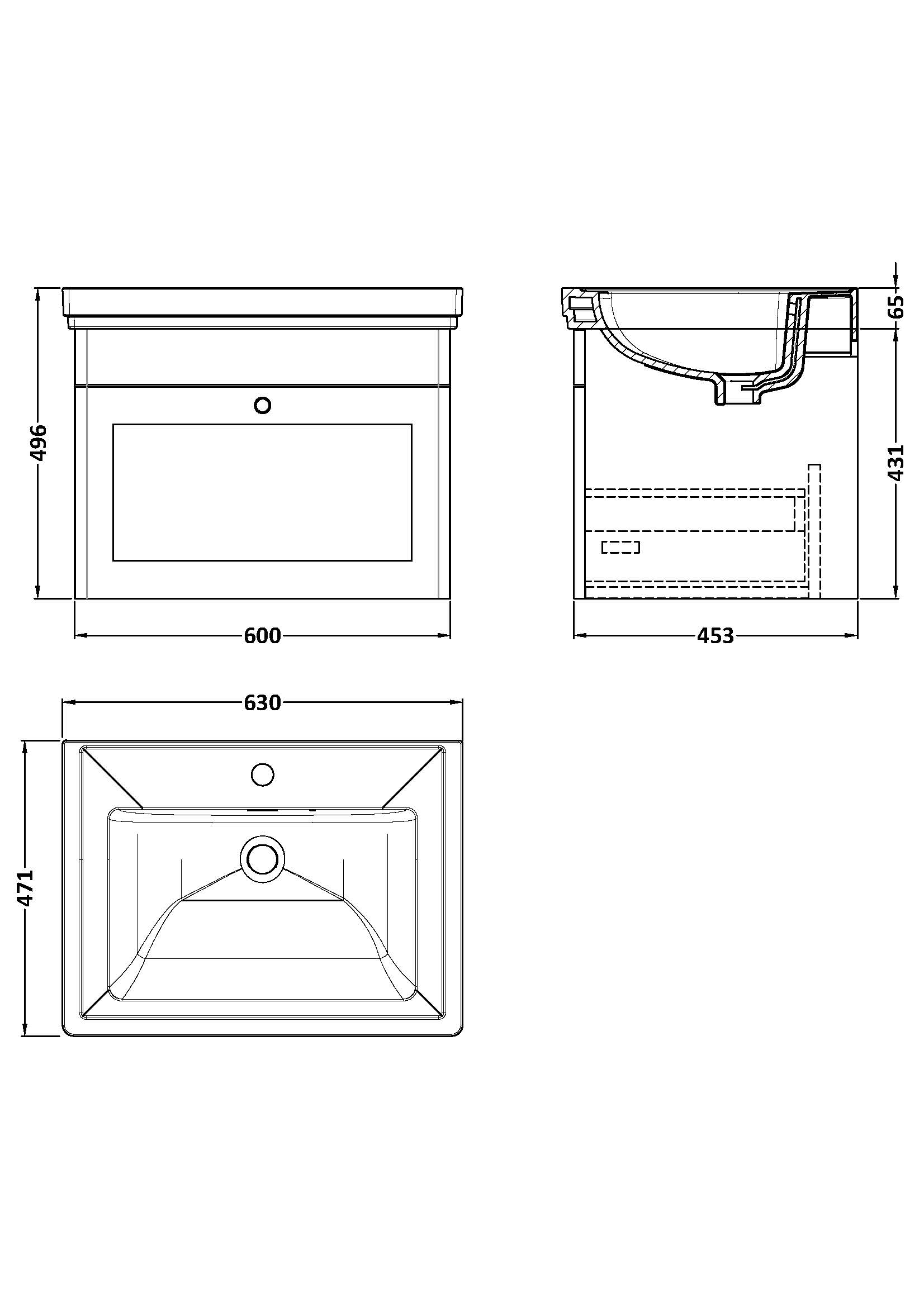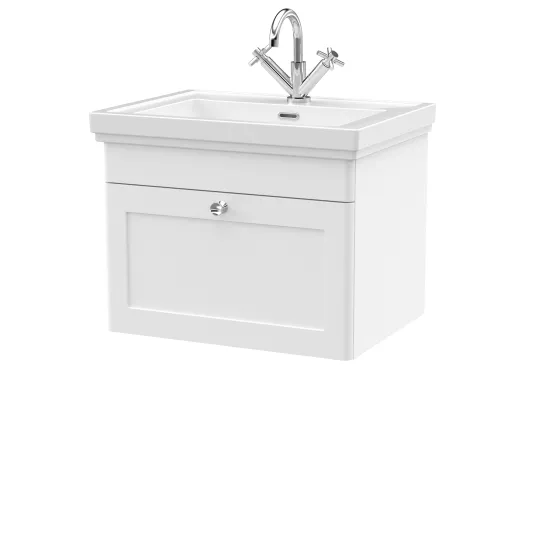 Classique Wall Hung 1 Drawer Vanity Basin Unit & 1 Tap Hole Fireclay Basin, 600mm