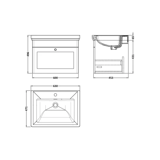 Classique Wall Hung 1 Drawer Vanity Basin Unit & 1 Tap Hole Fireclay Basin, 600mm