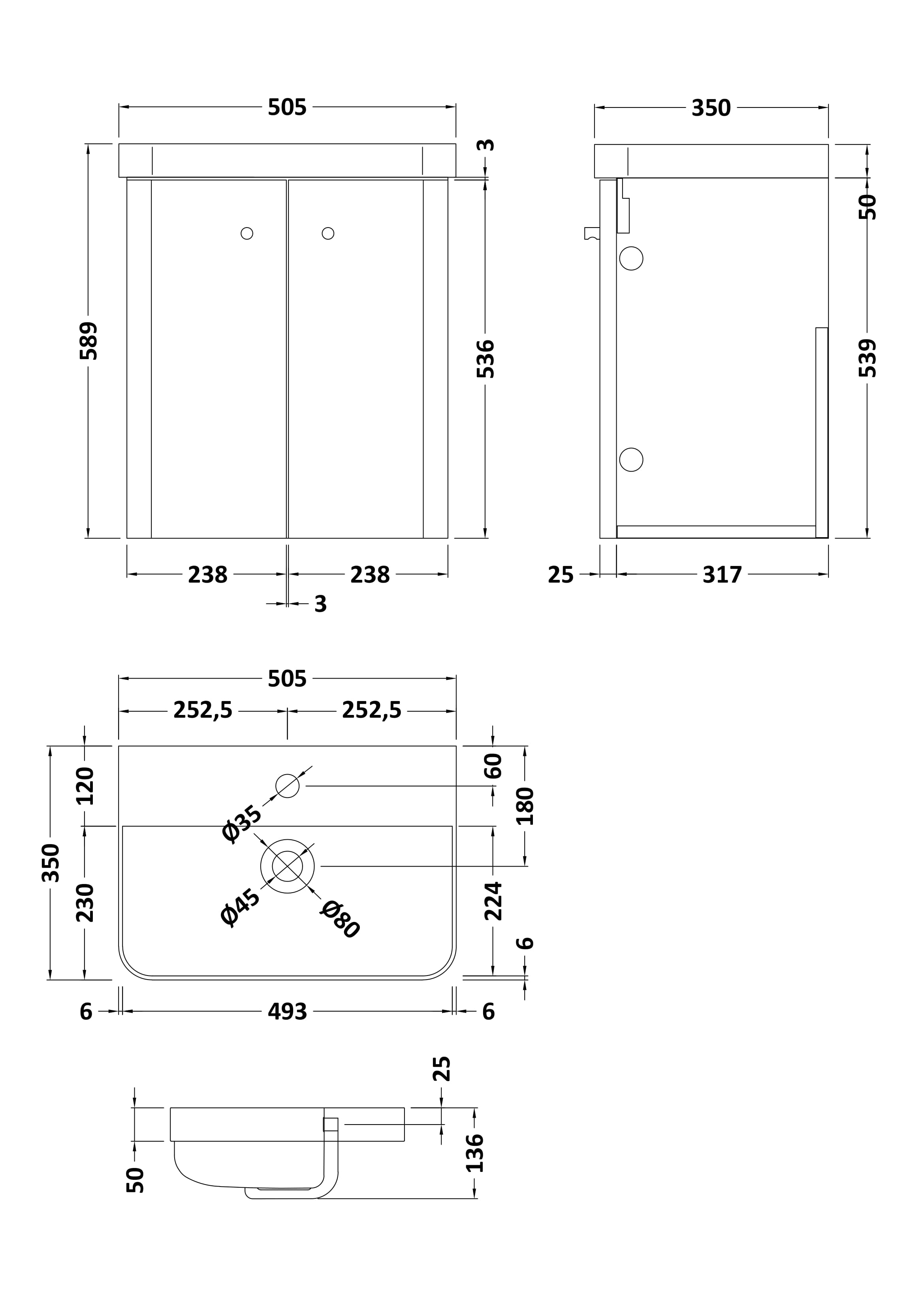 Core Wall Hung 2 Door Vanity Basin Unit & Ceramic Basin, 500mm