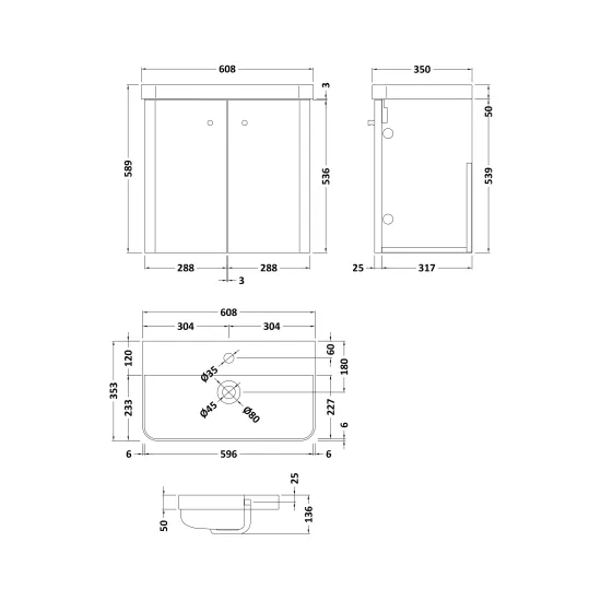 Core Wall Hung 2 Door Vanity Basin Unit & Ceramic Basin, 600mm