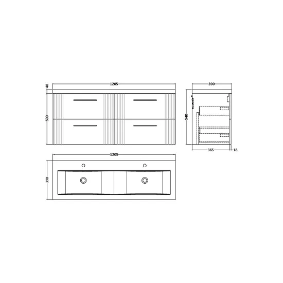 Deco 1200mm Wall Hung 4-Drawer Vanity & Double Basin