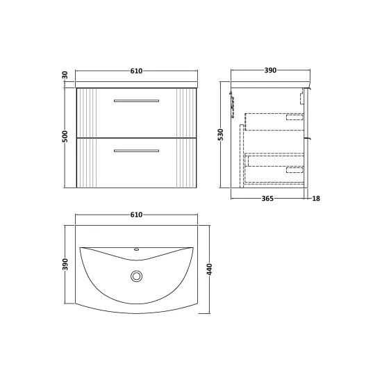 Deco 600mm Wall Hung 2-Drawer Vanity & Curved Basin