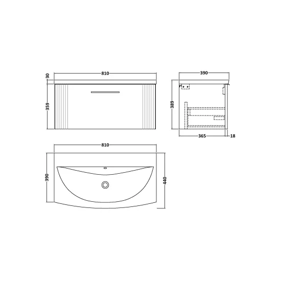 Deco 800mm Wall Hung Single Drawer Vanity & Curved Basin