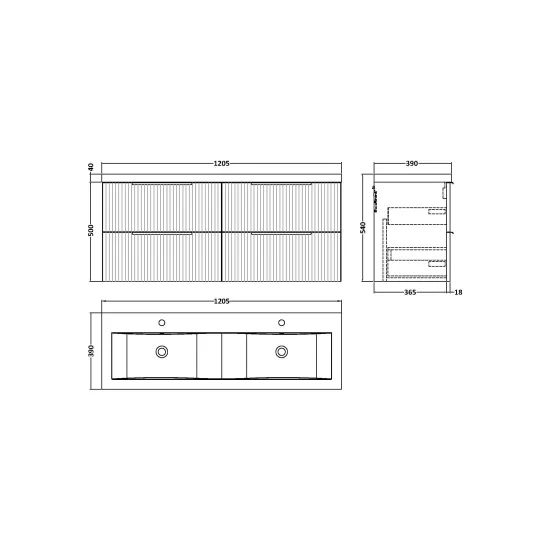 Fluted 1200mm Wall Hung 4-Drawer Vanity and Double Basin