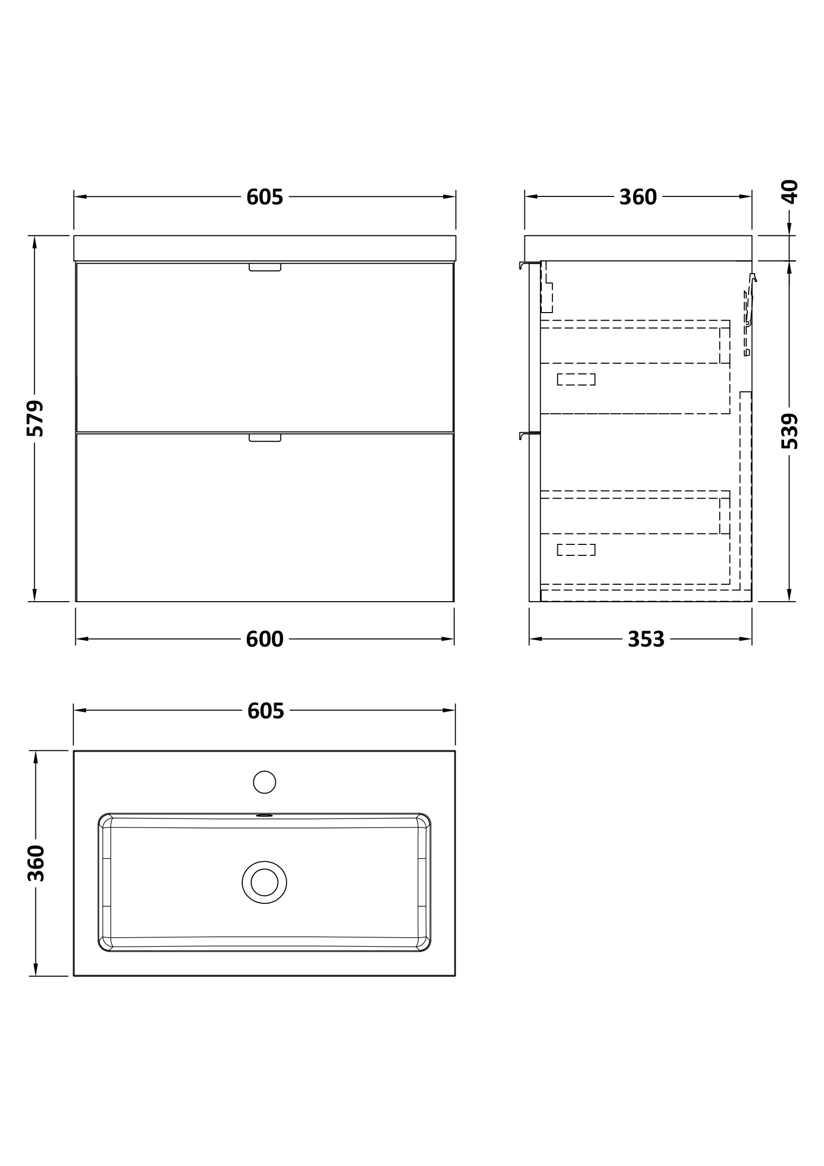 Fusion Wall Hung 2 Drawer Vanity Unit & Polymarble Basin 600mm