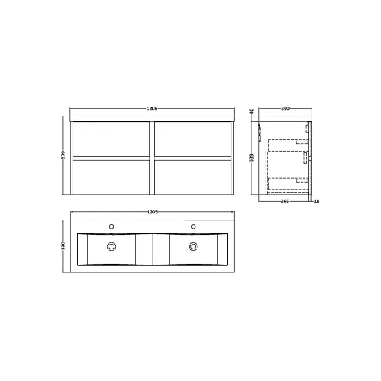 Havana Wall Hung 4 Drawer Vanity Basin Unit & Double Ceramic Basin, 1200mm