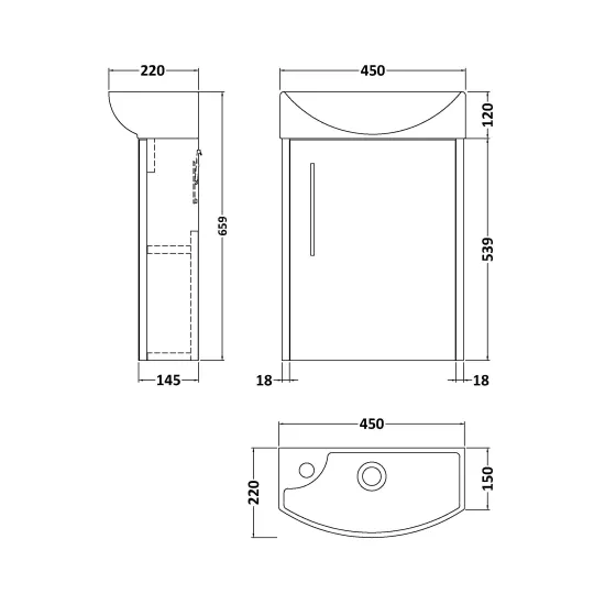 Juno Compact 440mm Wall Hung Single Door Unit and 1 Tap Hole Basin Right Hand