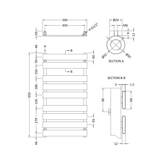 Minimum quantity for "Heated Towel Rail 950 x 500mm" is 1.