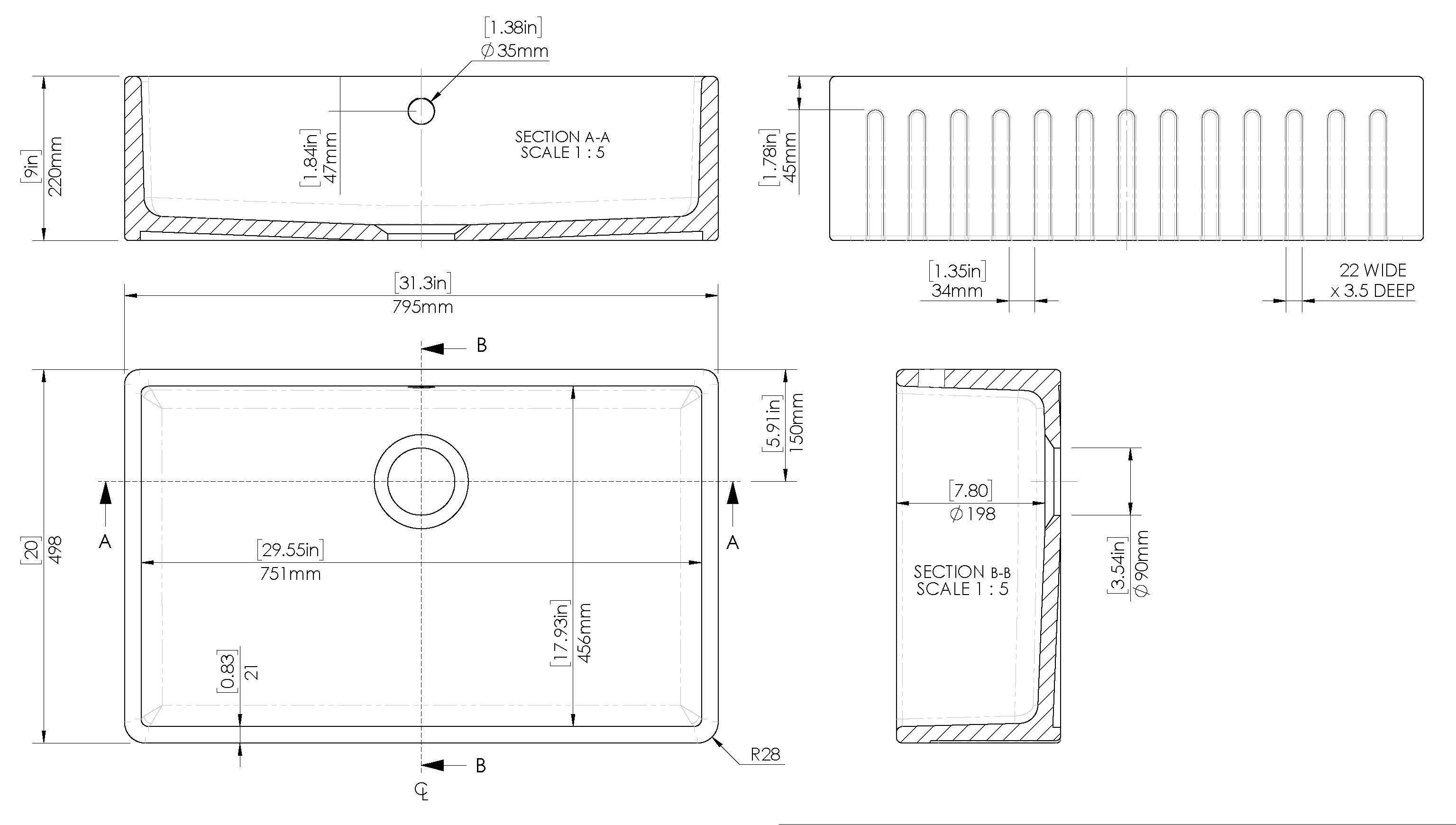 Butler Sink Fluted with Overflow 795mm x 500mm x 220mm