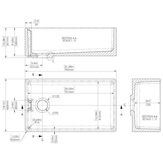 Fireclay Belfast Sink 795 x 460 x 245mm