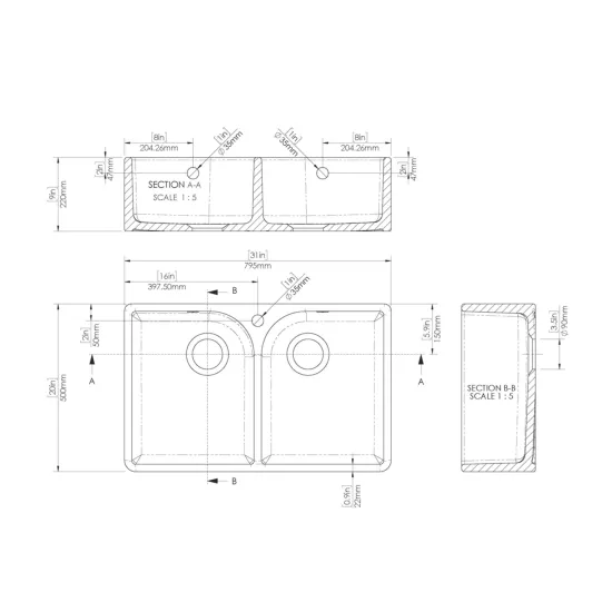 Fireclay Butler Sink Flush Weir & Overflow 795 x 500 x 220mm